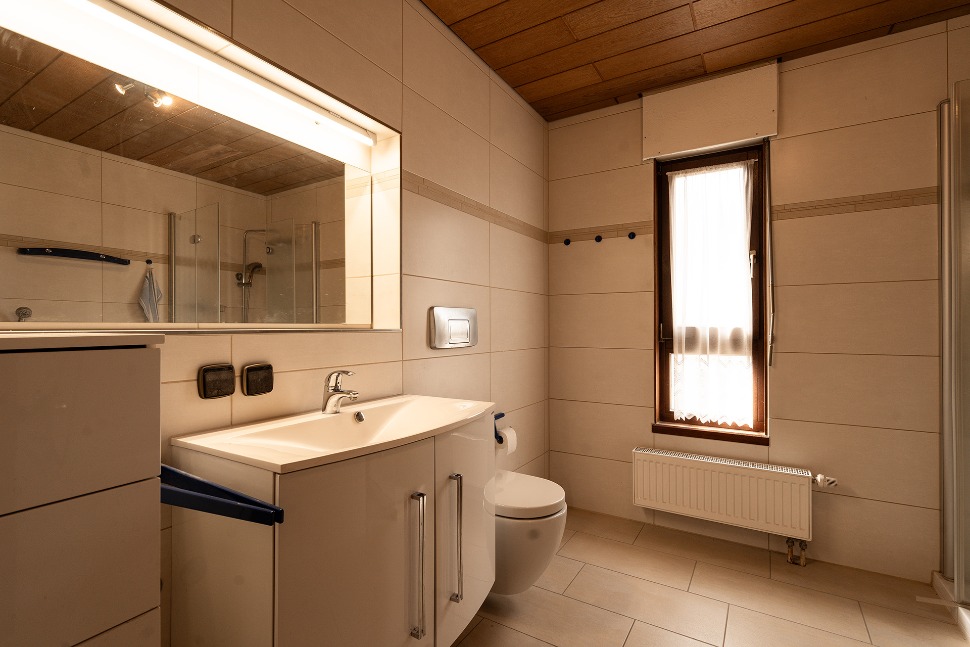 Vom einladenden Eingangsbereich gelangen Sie in ein modernes Gäste-WC (2024 saniert) sowie in die Küche, das Esszimmer und das großzügige Wohnzimmer mit gemütlichem Kachelofen, dessen Heizeinheit im Jahr 2020 erneuert wurde und der für behagliche Wärme sorgt. Auf dieser Etage befinden sich zudem ein Schlafzimmer, ein weiteres Zimmer – ideal als Kinder- oder Arbeitszimmer – sowie ein Tageslichtbad mit bodentiefer Dusche, das im Jahr 2015 vollständig saniert wurde. Damit ist komfortables Wohnen auf einer Ebene problemlos möglich.