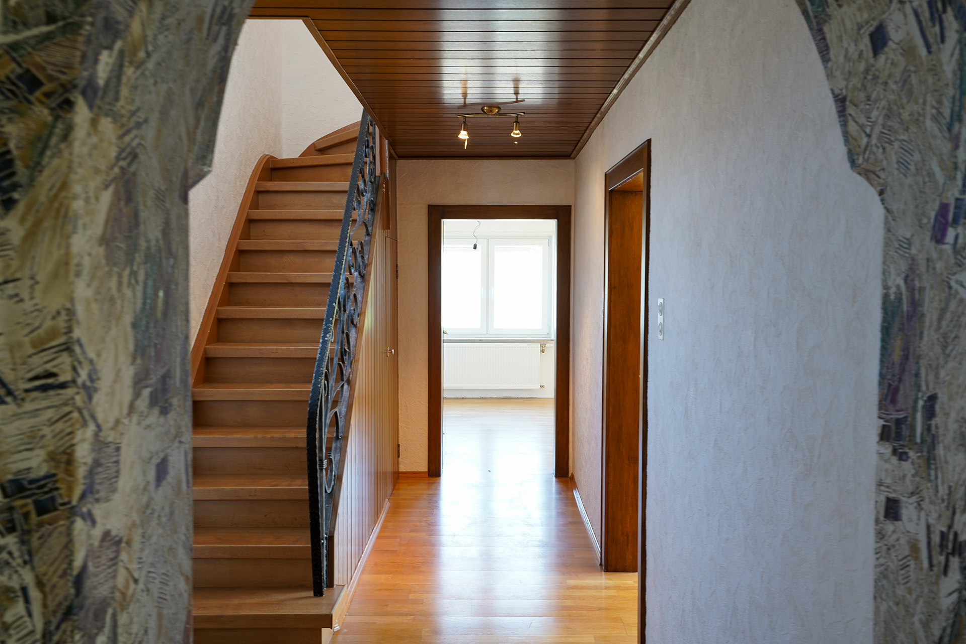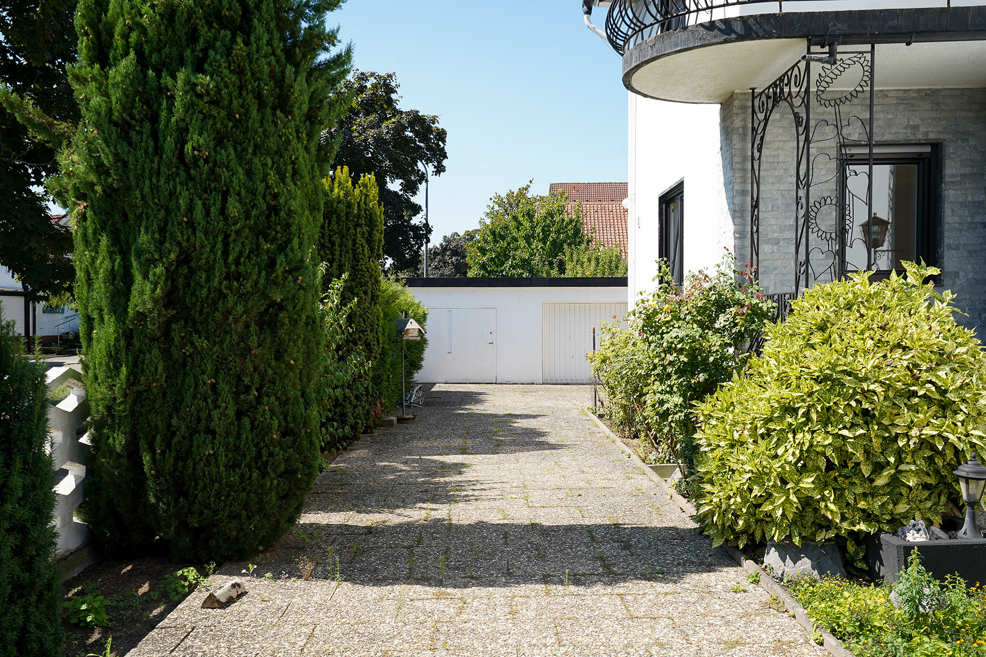 Zum Außenbereich gehören ein großzügiger Hof sowie ein kleiner, potenziell L-förmiger Garten mit ca. 50 m² Fläche, der aktuell als Unterstand genutzt wird, sich jedoch problemlos in eine Rasenfläche oder Rollrasen umgestalten lässt. Zwei Balkone laden zum Entspannen ein. Zudem kann die bestehende Durchfahrt für ca. 3.000 € zu einer vollwertigen Garage umgebaut werden. Im Untergeschoss besteht die Möglichkeit, das Bad zu vergrößern, da hier keine tragende Wand entfernt werden müsste.